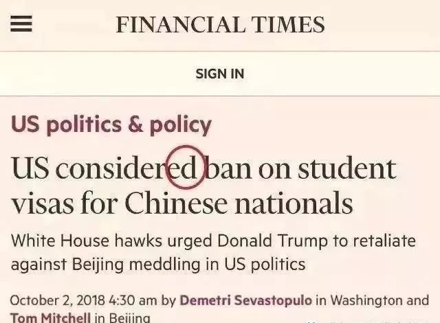 消息的起源是英国《金融时报》的一篇报道“US considered ban on student visas for Chinese nationals”。