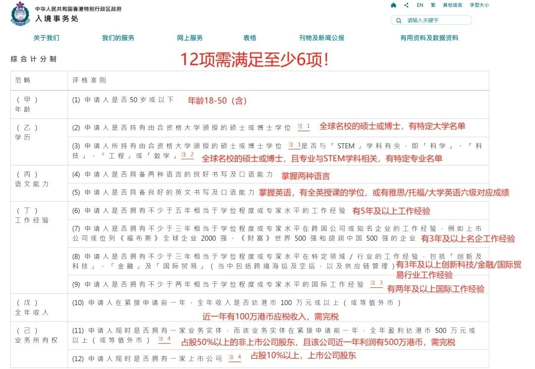 针对申请人的年龄、学历、语文能力、工作经验、全年收入和业务所有权,这六大范畴设置了12道评核准则,申请人须满足其中6个条件才可以递交申请!