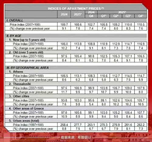 2023至2025年这三年间,希腊公寓价格的年均涨幅分别达到13.9%、9.1%和7.4%。不难发现,房价上涨节奏虽有小幅放缓,但整体仍处于欧洲房地产市场中活跃度较高的上行区间。