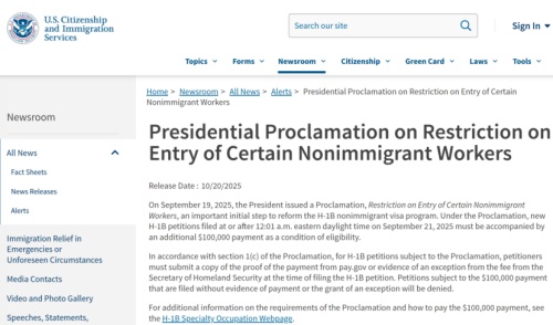 10月20日,美国移民局(USCIS)在官网发布了关于H-1B 10万美元新规的最新说明,对外界最关心的几个问题作出了正式回应。
