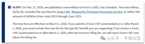 加急审核费调增: USCIS发布了新版G-1055费用表,确认自 2026年3月1日起,I-907加急审核申请费将根据通胀率调增。
