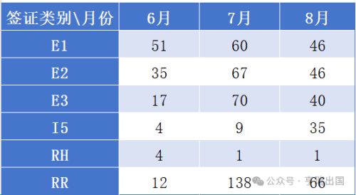 EB-1、EB-2、EB-3在6-7月签发量稳步增长,7月达到峰值,8月虽略有回落,但仍保持合理水平。
