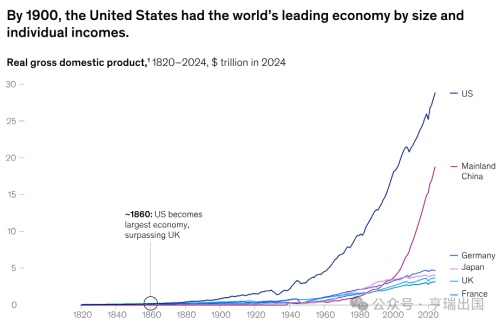 GDP总量的超越: 约在1860年左右,美国的经济总量正式超越英国,成为全球最大的经济体。此后,美国在长达一个多世纪的时间里保持了显著的领先优势。