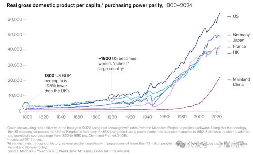 人均收入的领先: 约在1900年,美国成为全球最富裕的大型国家。尽管在1800年时,美国的人均GDP还比英国低约25%,但到了20世纪,美国在生产效率和国民财富积累上实现了跨越。