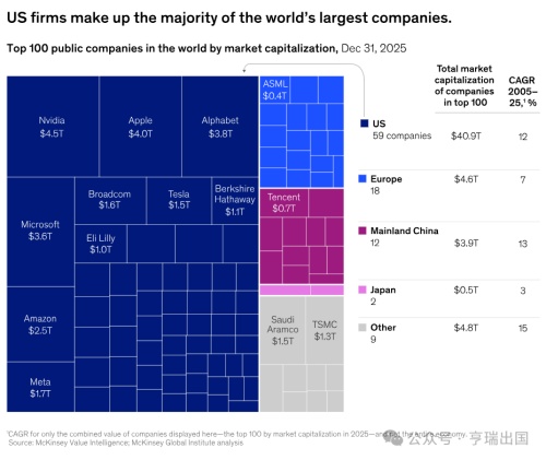 截至2025年底,在全球市值最高的100家上市公司中,美国占据了59家,总市值高达40.9万亿美元。相比之下,欧洲拥有18家(市值4.6万亿),中国大陆拥有12家(市值3.9万亿)。