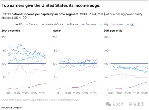 对于高收入群体而言,这一优势尤为显著:美国收入最高的10%人群的收入比欧洲主要经济体和加拿大同等收入人群高出10%到50%。或许鲜为人知的是,美国收入最高的40%人群的收入高于欧洲主要经济体的同等收入人群,而收入最高的20%人群的收入则高于加拿大同等收入人群。