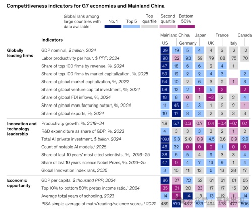 通过对G7国家与中国大陆的综合指标对比,报告呈现了以下特征: