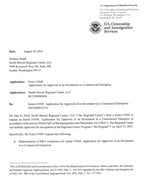 I-956F已获批:项目I-956F已于2024年8月30日成功获得美国移民局批准,全程仅用了2个月,彰显项目实力和合规优势。投资人I-526E有优先审批权。